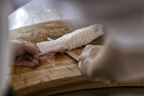 Für die Fischfarce wird des Anglers Fisch von seiner Karkasse (derWirbelsäule) getrennt.Nun werden die Haut und der Bauchlappen des Fisches entfernt und mit Hilfe eines Mixers zu einer feinen Farce verarbeitet.Für diese Farce fügen wir zu den Fischabschnitten 30 ml vom reifenWein ohne Meerwasser, 4 cl mutige Fee, das Bio-Freilandei, 50 ml Schlagobers, Salz und Pfeffer sowie 1-2 Eiswürfel hinzu und mixen es zu einer feinen Creme.