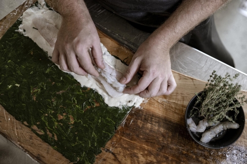 Diesen überkochen wir für 30 Sekunden in kochendem Wasser und schrecken ihn im Anschluss mit Eiswasser ab, damit er sein schönes Blattgrün beibehält. Der junge Freund darf nicht mit aufs Meer, so bleibt er auf dem Trockenen: er wird mit den Händen gut ausgedrückt, um sämtliches überschüssiges Wasser zu entfernen. Nun wird der Blattspinat zwischen Klarsichtfolie oder Backpapier mit einem Nudelholz gleichmäßig auf ca.2 mm ausgerollt und im Tiefkühler aufbewahrt.